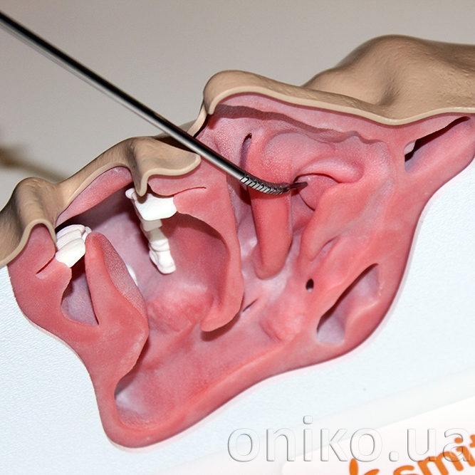 The Sinus & Tonsil Trainer is a trainer for otolaryngology use. It features a pliable hemisected right nasal cavity and nasopharynx within a rigid partial head. The CT-derived anatomy includes the maxillary, frontal, and sphenoid sinuses, palatine, lingual, and pharyngeal tonsils, and the superior, middle, and inferior turbinates. It is designed to demonstrate access and interaction of a variety of ENT devices within this space.