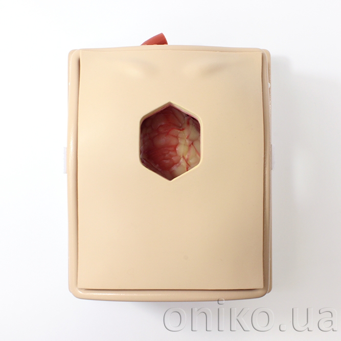 Накладка для міністернотомії призначена для навчання та демонстрації процедур часткової стернотомії. Модель встановлюється на тренажер грудної клітки та дозволяє відпрацьовувати виконання мінімального розрізу грудини та доступу до серця.
