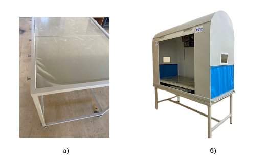 Рис. 1. Стіл для рентгенографії з шипами (а) та захисна кабіна (б)