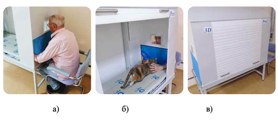 Вихід із такої ситуації, мабуть, простий. За кордоном вже все вирішено, і вони знають, як це зробити. До того ж на конференціях за кордоном доповідалося про спеціальні кабіни, куди під час рентгенівського обстеження саджають тварин. Інтернет надає інформацію: у 2024 році спочатку в Чорногорії на конференції з радіаційного захисту «RAD 2024» [2], а потім у Македонії на конференції «Days of veterinary medicine» [3] дійсно були доповіді про захисні кабіни для рентгенівського ветеринарного обстеження. Під час обговорень фахівці з радіаційного захисту та ветеринари із закордонних університетських клінік підкреслювали, що це є проблемою. Вони також фіксують тварин руками, і це небезпечно. Використання захисних кабін (рис. 1,б) є обґрунтованим і доцільним. Таким чином, за кордоном дійсно є інформація про кабіни. Час поширити цю інформацію в Україні, тим більше, що вже є можливість побачити працюючі кабіни в Києві та Львові.