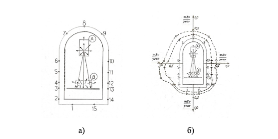 Для вирішення цього питання слід враховувати, що рентгенівське випромінювання всередині кабіни має дві різні складові: пряме та розсіяне. Джерелом прямого випромінювання (зона А, рис. 3,а ) є анод рентгенівської трубки при подачі імпульсу напруги живлення. Пряме рентгенівське випромінювання в цільовому напрямку формує рентгенівське зображення досліджуваної ділянки тварини. Поле випромінювання в цільовому напрямку поєднують із рентгенчутливим полем приймача − плоскої панелі. Поглинена й корисно використовувана приймачем частина рентгенівського випромінювання в цільовому напрямку наводиться в паспорті і становить 50...70%. Інші 50…30% рентгенівського випромінювання проходять панель практично без поглинання. Це найбільш потужний рентгенівський потік, що не використовується. Для його придушення безпосередньо за приймачем встановлюється свинцевий екран товщиною до 2 мм. Він знижує цю частину прямого рентгенівського випромінювання до допустимого рівня.