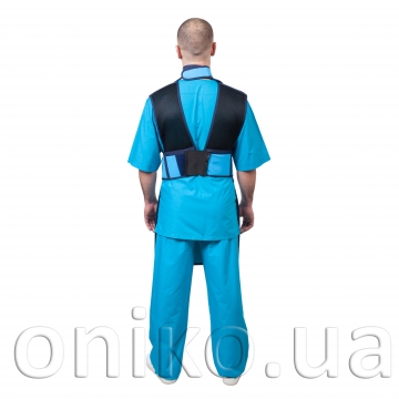 The apron strap is connected with a light mesh back and is fastened in the lumbar region with a strap in the back, and with textile fasteners (velcroes) and the center of the fastex (carbine) in the front along both sides.