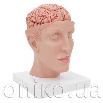 This brain comes with opened head to allow detailed study of the brain's position in the skull. The human head is horizontally divided above the skull base. This medially divided deluxe brain model shows the brain arteries in detail. Both halves of this brain model can be disassembled into: