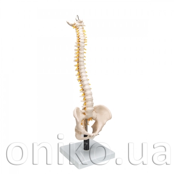Soft discs add greater realism to this spine model! This unique spine shows how the discs deform during normal and abnormal positioning. Use it to demonstrate any number of pathological conditions of the spine such as scoliosis, lordosis, kyphosis, or subluxations. Herniation of the vertebral column can be demonstrated with compression. In addition, the special mounting allows unobstructed viewing during demonstration and display of the spine. This spine model includes spinal cord and spinal nerves. The spine comes with its own, removable stand.