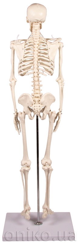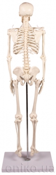 Scaled down reproduction of a human skeleton in about half life size. Skull, arms and legs can be disarticulated. The skull can be disassembled in three parts.