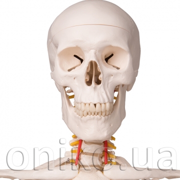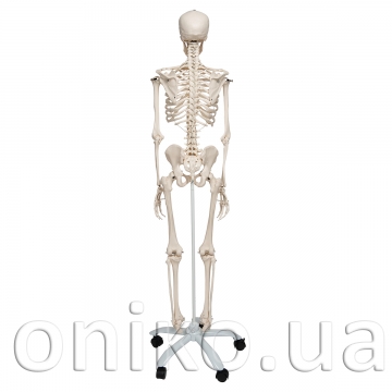 Fred's bendy spine can copy almost any human movement too. Once bent, Fred will remain in that position, to show correct and incorrect postures as well as any pathological malalignments. All skull movements can be shown on the head joints. Protruding spinal nerves and vertebral arteries are also shown on this skeleton, as well as a dorsolateral slipped disc between the 3rd and 4th lumbar vertebrae. Now available on a stable metal stand with 5 casters!