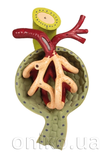 The third one illustrates Malpighian corpuscle with the Bowman‘s capsule, 700 times life size. All these models are a great instrument to understand the kidney anatomy in all the inner details.