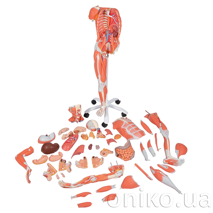 This muscle figure is the finest teaching tool available! Standing over 4 1/2 feet tall, this 3/4 life-size human replica depicts deep and superficial musculature in addition to the body's major nerves, vessels, tissues and organs in exquisite detail. The internal organs are removable (45 pieces in all) to reveal the fundamental interrelationships of human morphology. Remove the calvarium to view the 3-part removable brain. Look beneath the liver to reveal the gallbladder and bile duct. Peer inside the appendix, stomach lungs, heart or kidney. Remove and view the details of 13 different muscles of the arms and legs.