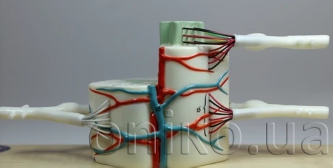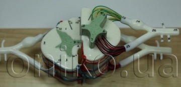 Six-times life-size, this vinyl plastic model replicates a segment of the upper thoracic spinal cord. Sectioned both longitudinally and in cross section, a portion of white matter of the right half has been cut away to expose the anterior and posterior nerve roots. Color-coding differentiates nerve fiber type and a color-keyed circuitry schematic is mounted along with the model on a hardwood base. 30 numbered features are identified in a corresponding key.