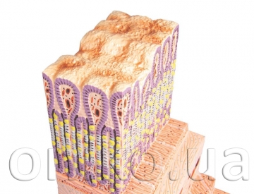 This one-piece model, 150 times life size, is an important tool to study the histology of the most important organ of the digestive system: the stomach. All the different layers from the epithelium to the serous coat are represented with great accuracy and detail. The principal structures, including different cellular types, capillary and lymphatic vessels are numbered and identified. Mounted on base.
