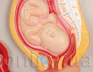 This model shows the process of fetal development from the unfertilized ovum to the 9th month of gestation. The model consists of 5 parts, mounted on a board that corresponds to the following developmental stages: ovulation; fertilization; zygote formation; and uterine implantation. The fetus is also shown at 2 weeks, 8 weeks, 12 weeks and 9 months of development. Mounted on board.