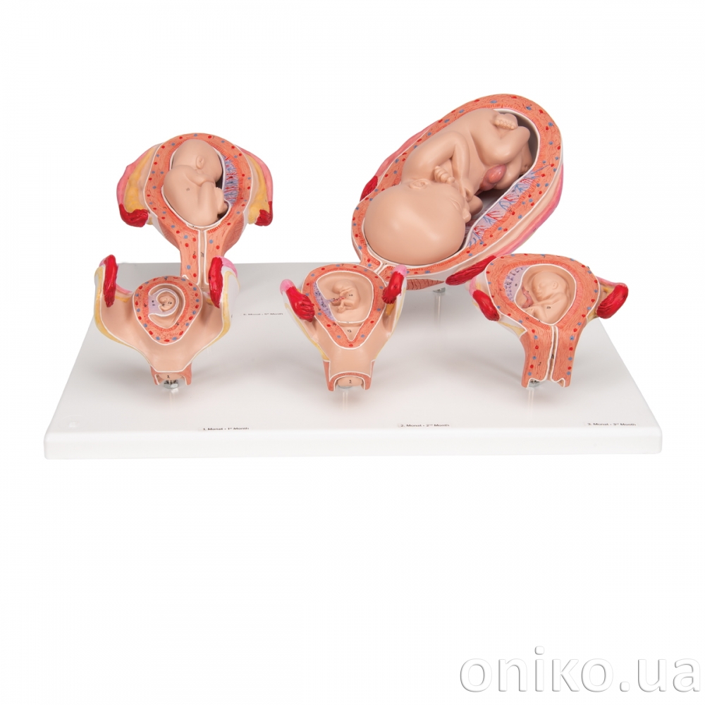 This series shows the most important stages of development of embryo or foetus. All models are mounted together on a base.