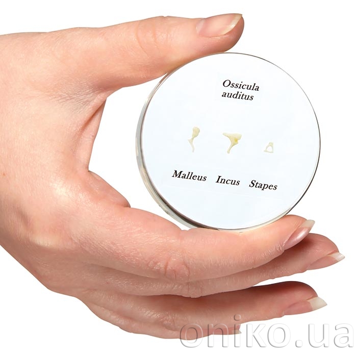 The human auditory ossicles, individually presented in natural position, embedded in transparent acrylic. This life size auditory ossicles are cast from natural specimen.