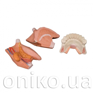 This tongue model shows the lower jaw up to the second molar, the tongue with mouth floor musculature in median section and the right sublingual and submandibular gland.