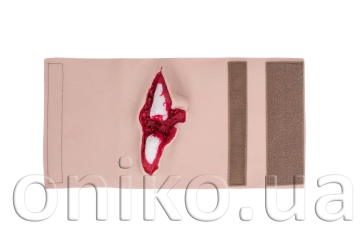 Realistic moulage of open fracture of tibia. The emergency simulation moulage gives you better understanding of complex open fracture wounds. The elastic fixation system with an extension accessory allows to use the moulage on any leg size of an assistant or mannequin. Made of soft elastic silicone, highly durable. Using additional make-up will make your training even more realistic. Moulage is very easy to clean after the training if professional makeup cosmetics and fake blood is used.