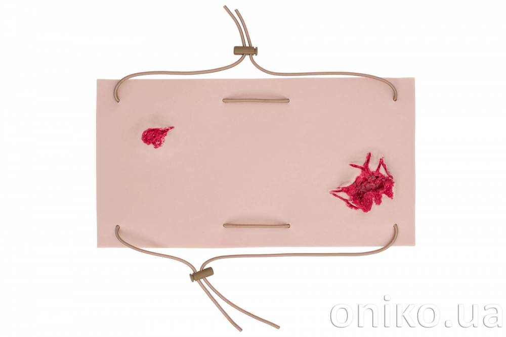 Wearable ultra-realistic moulage of gunshot through wound (GSW) of the limb with entry and exit. The emergency simulation moulage gives you better understanding of GSW. The adjustable elastic fixation system allows to use the moulage on any arm or leg size of an assistant or mannequin.