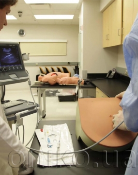 Ultrasound Paracentesis Trainer ultrasound compatible trainer allows the user to perform diagnostic and/or therapeutic paracentesis. The anatomically correct trainer is positioned to simulate a patient sitting up at a 45-degree angle with a distended abdomen and includes the pubic symphysis, iliac crest, and umbilicus. The inferior epigastric vessels can be visualized under ultrasound.