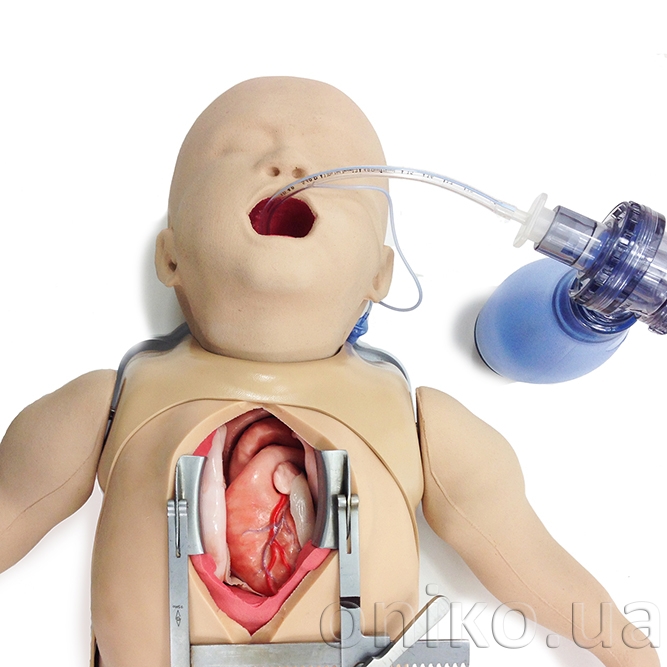 Тренажер сумісний із широким набором компонентів, включаючи кардіоторакальний модуль серця, аорту, серце, що б’ється, шкіру, ребра, судини та інші змінні елементи.