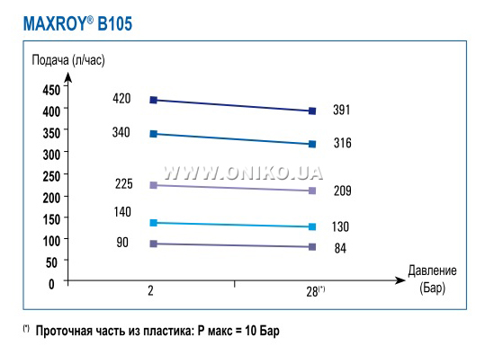 - Подача до: - 64 л/час для MAXROY® D105; - 410 л/час для MAXROY® A105; - 420 л/час для MAXROY® B105; - 1100 л/час для MAXROY® B145